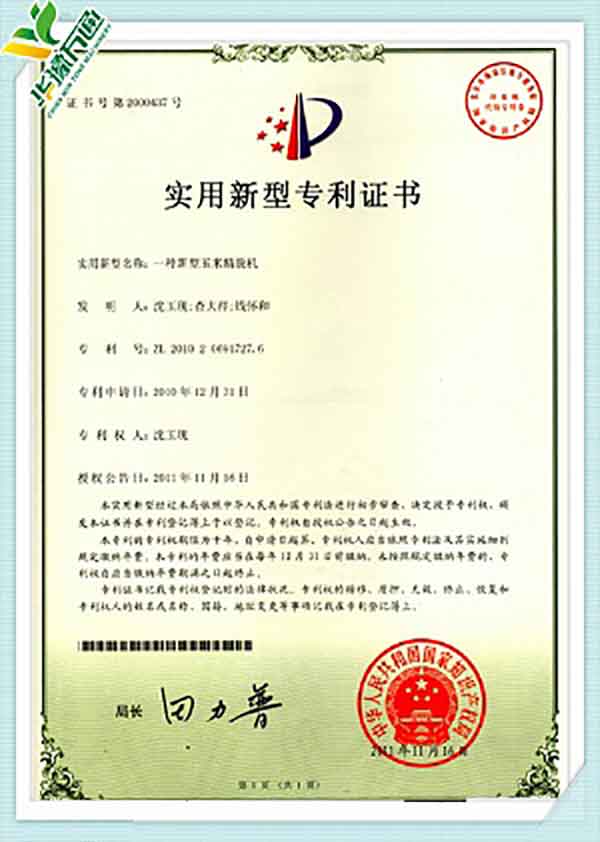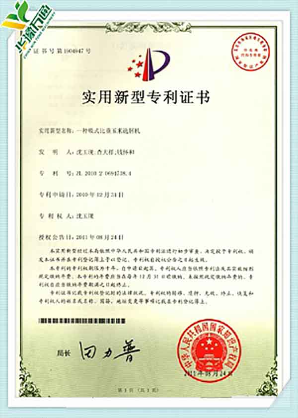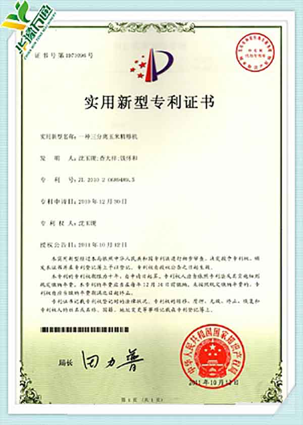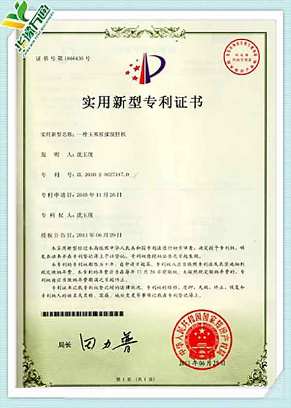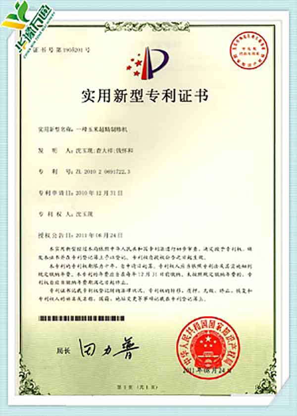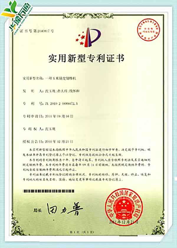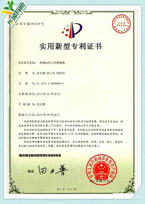 New Type Corn Huller Patent Quality Management System Certificate(English Version)