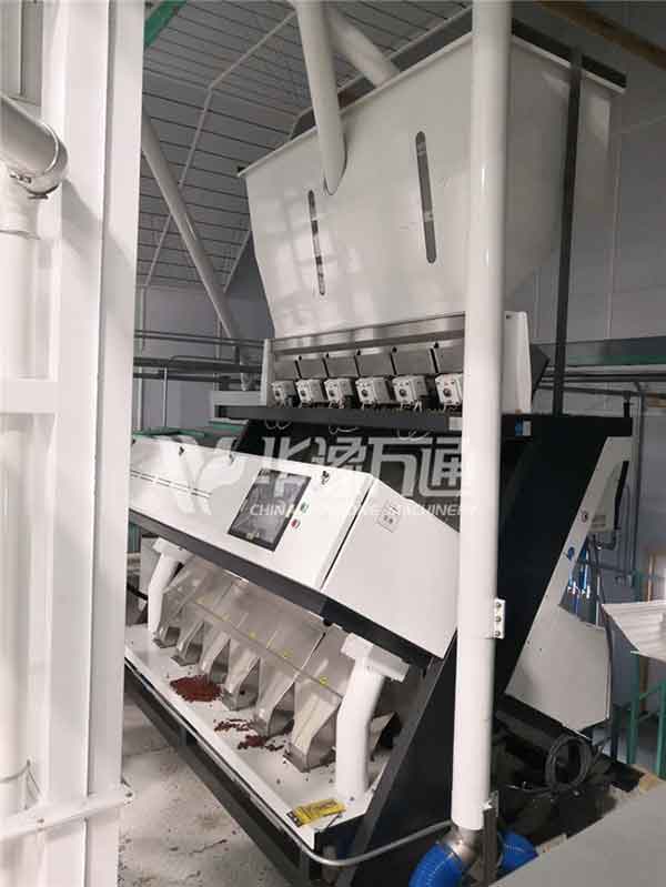 One round of selection and two round of brushing ensures the quality of lustrous beans,with features of high yield, low broken rate and uniform granules.After color sorting, the beans up to national standard can be packaged. One round of selection process removes impurities in the bean; two rounds of polishing processes dedust the materials to increase lustrousness;the vibration sifter grades out broken beans in the finished products while the complete fine beans are conveyed to color sorter.The sorted kernels are selected again and then are conveyed to packaging cabinet.