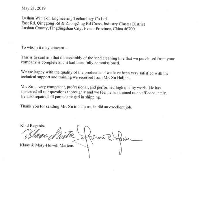 Your machines are strongly built. The motors and gear reductions are very heavy. They are built stronger than American made electric motors. When our cleaning line is completed, we are interested in getting a price for a dedusting system to install in our animal feed mill.