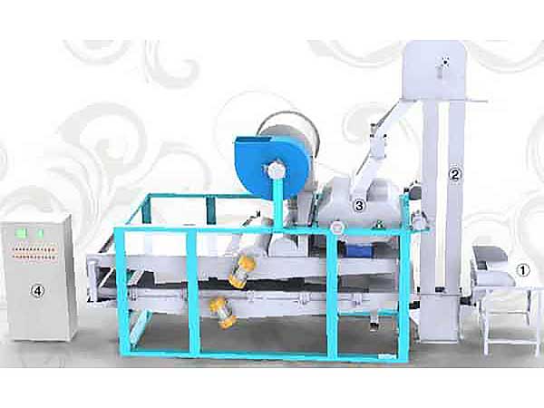 It consists of input hopper ①, bucket elevator ②, dehullers ③, electric control cabinet ④.
